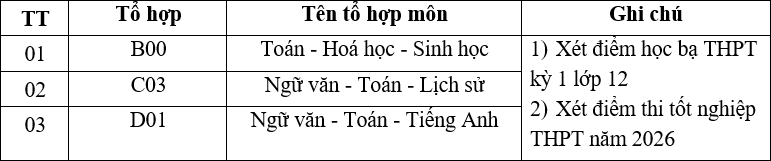 1.1. Xét điểm học bạ THPT kỳ 1 lớp 12 theo 03 tổ hợp môn sau (chọn 01 trong 03 tổ hợp dưới cộng điểm TB 3 môn lại >= 15đ):