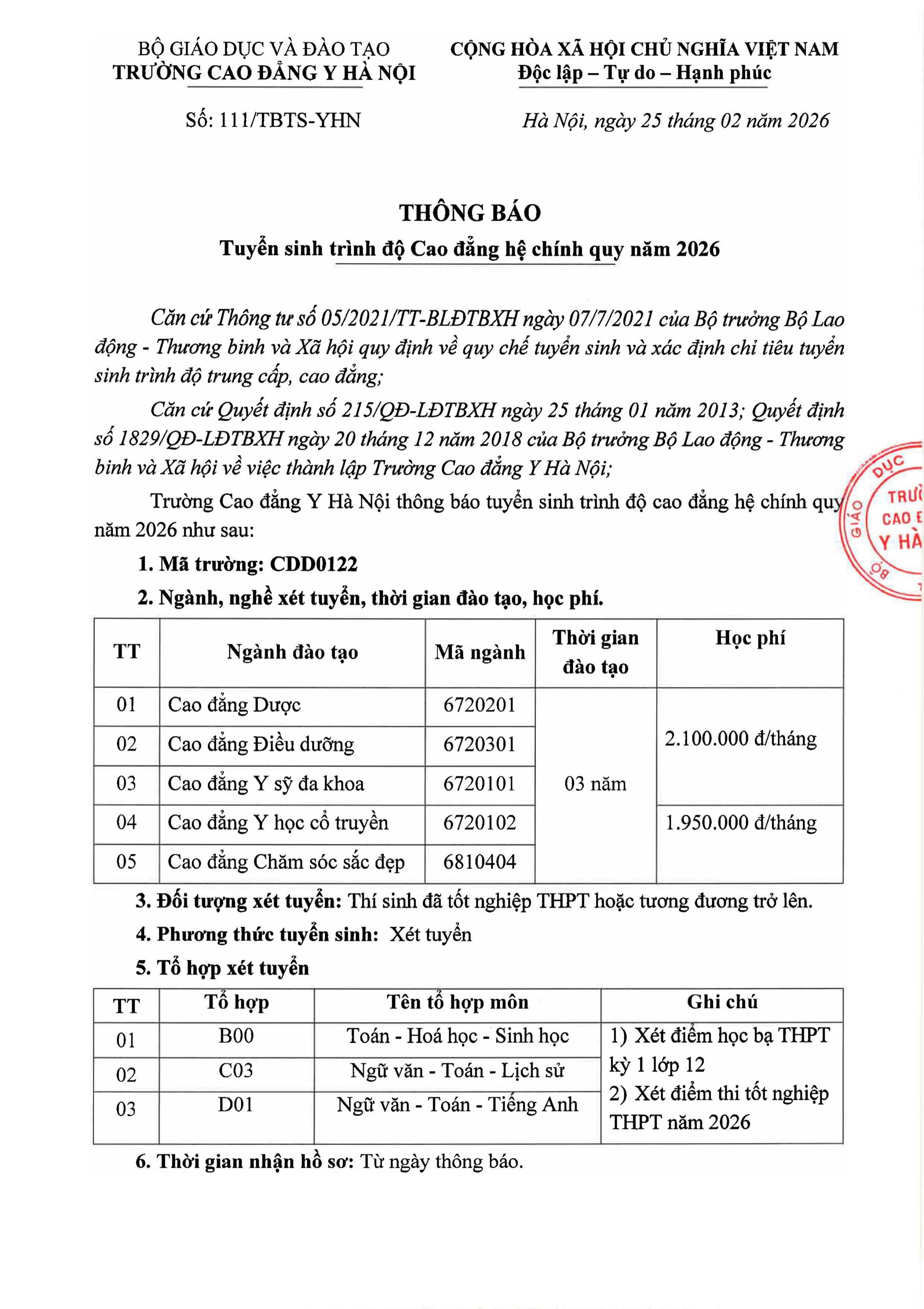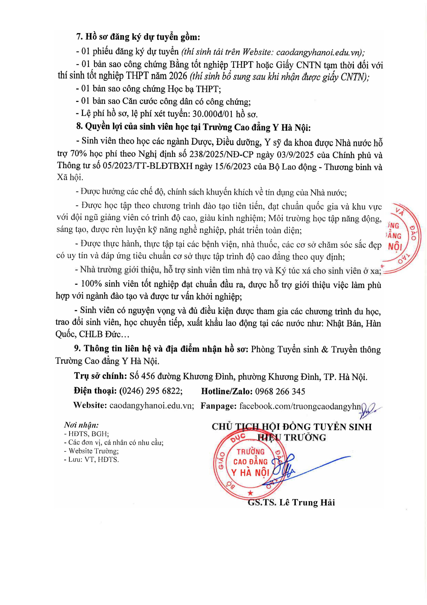 *Địa chỉ gửi bưu điện: Trường Cao đẳng Y Hà Nội – Trụ sở đào tạo chính: Số 456 đường Khương Đình, Phường Khương Đình, TP. Hà Nội
