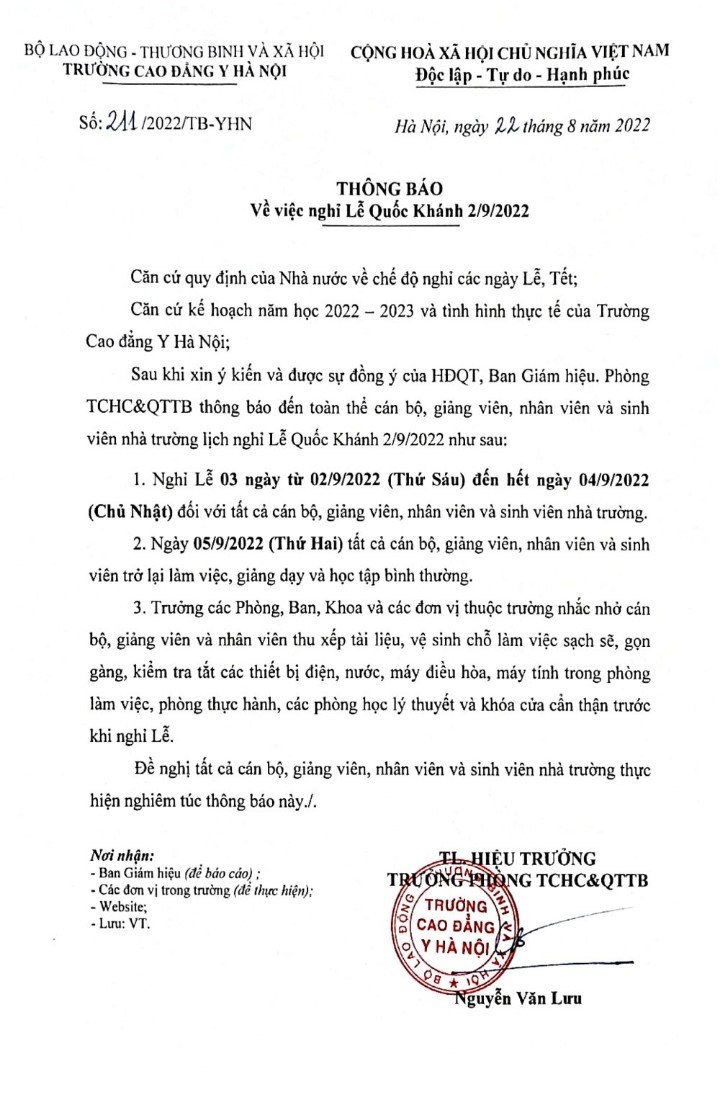 Trường Cao Đẳng Y Hà Nội Thông báo nghỉ lễ Quốc Khánh 02/9/2022